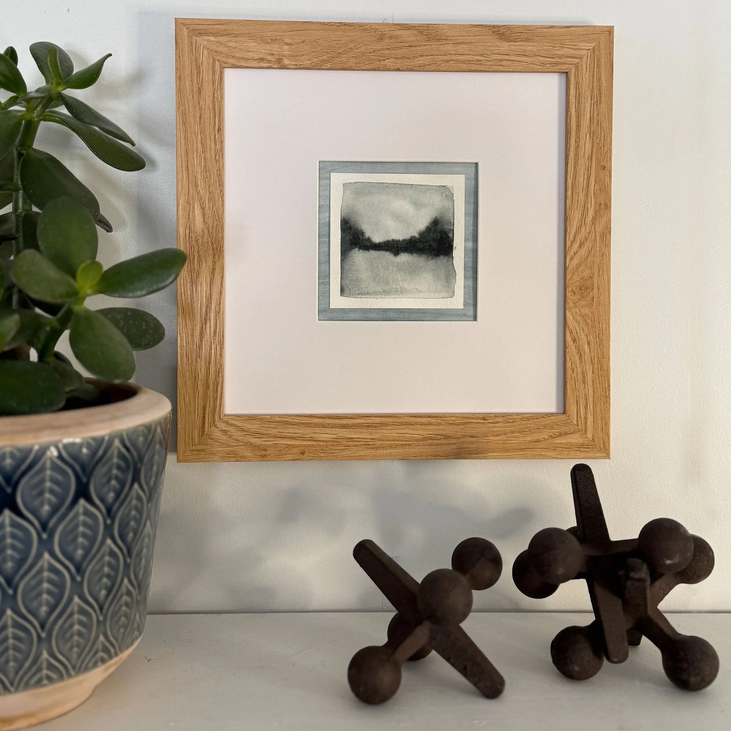 Painting can be purchased framed Beautifully floating inside of a 4” opening in an 8” mat, and surrounded by a natural oak frame.